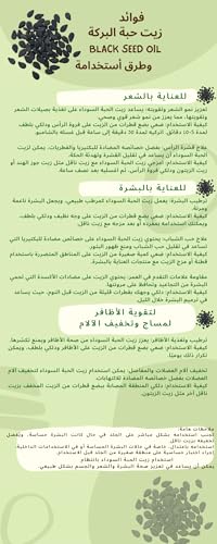 - زيت بذور سوداء نقي 100%: معصور على البارد من بذور نيجيلا ساتيفا عالية الجودة، مما يضمن بقاء الزيت خاليًا من المواد الكيميائية والمواد المضافة للحصول على منتج طبيعي تمامًا.