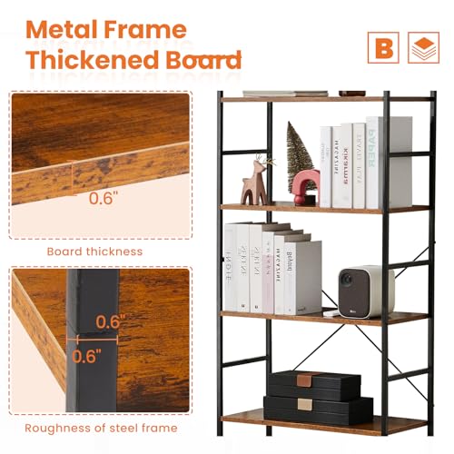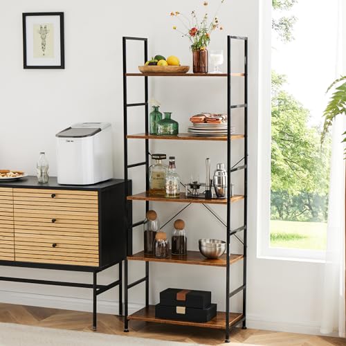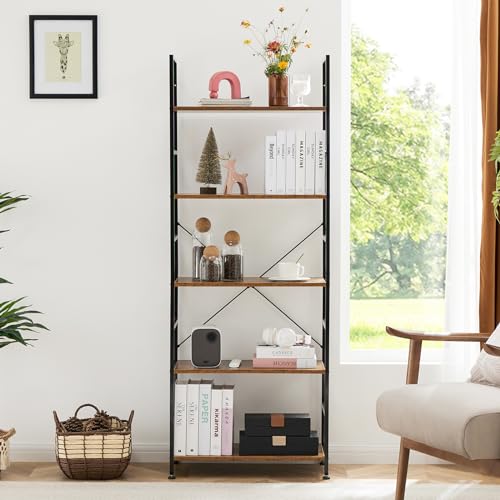 OLIXIS - اوليكسيس رف كتب من 5 طبقات - منظم تخزين خزانة صناعي طويل عصري وحدة رفوف متعددة الاستخدامات للاقراص المضغوطة - الافلام - الكتب - بني انيق للمنزل والمكتب وغرفة المعيشة والمطبخ النوم مدهون