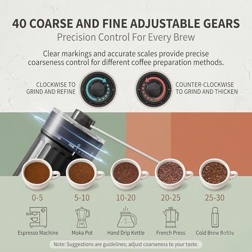 - [40 إعدادًا خارجيًا للطحن لتناسب كل طريقة تحضير] - من الإسبريسو إلى القهوة التي يتم تحضيرها بالتنقيط، والفرنش بريس، وغيرها، قم بضبط درجة الطحن بسهولة تامة باستخدام الحلقة الخارجية سهلة الاستخدام للحصول على الطحن المثالي. قل وداعًا للأراضي المتناثرة الفوضوية واستمتع بطحن نظيف ودقيق لتجربة قهوة محسنة في كل مرة. أطلق العنان للإمكانات الكاملة لحبوب القهوة الخاصة بك بكل سهولة!