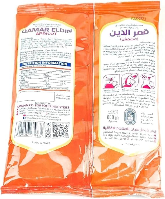 - نكهة قمر الدين الأصيلة: مسحوق شراب سريع التحضير بطعم قمر الدين اللذيذ والمنعش، مثالي للاستمتاع في أي وقت من اليوم