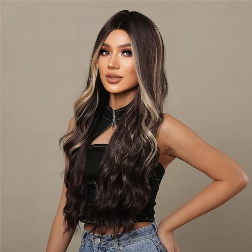 Generic - شعر مستعار مموج طويل بني متدرج للنساء، شعر مستعار مموج من المنتصف للاستخدام اليومي
