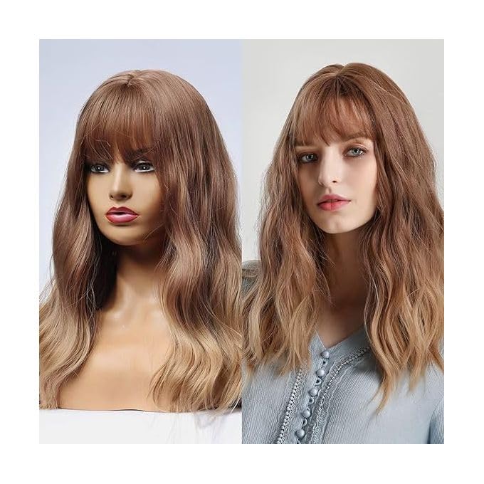 Generic - باروكة شعر نسائية بنمط أومبري متدرج من البني إلى الأشقر مع غرة، شعر مموج طويل