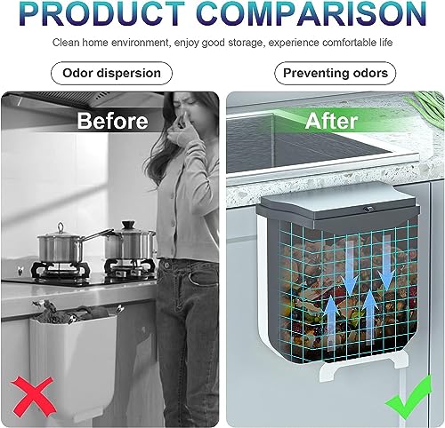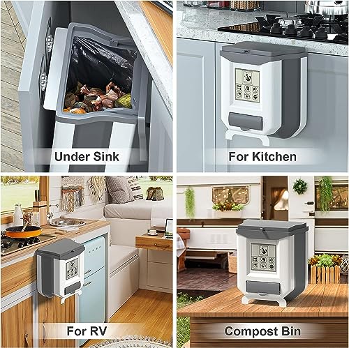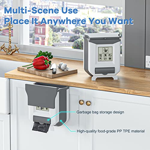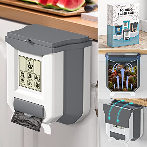 Onadak - سلة مهملات للمطبخ مع غطاء من أوناداك، سلة مهملات معلقة، سلة مهملات قابلة للطي لسطح الطاولة، سلة سماد للمطبخ / الخزانة / السيارة / الحمام / غرفة النوم / المكتب / المطبخ (2.4 جالون، رمادي وأبيض)
