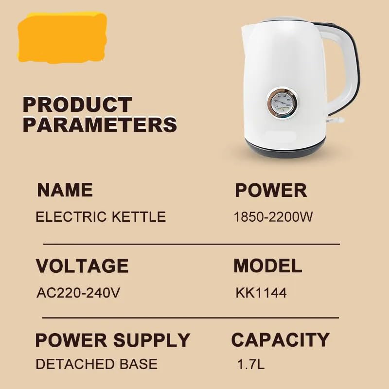 - الجهد: تيار متردد 220-240 فولت ~ 50/60 هرتز الإخراج: 1850-2200 واط السعة: 1.7 لتر عنصر تسخين مخفي من الفولاذ المقاوم للصدأ فلتر قابل للإزالة والغسل يتوقف التشغيل تلقائيًا عند غليان الماء مع مؤشر ضوئي لمفتاح التشغيل/الإيقاف ضوء واحد حماية من الغليان والجفاف سلك طاقة دوار 360 درجة