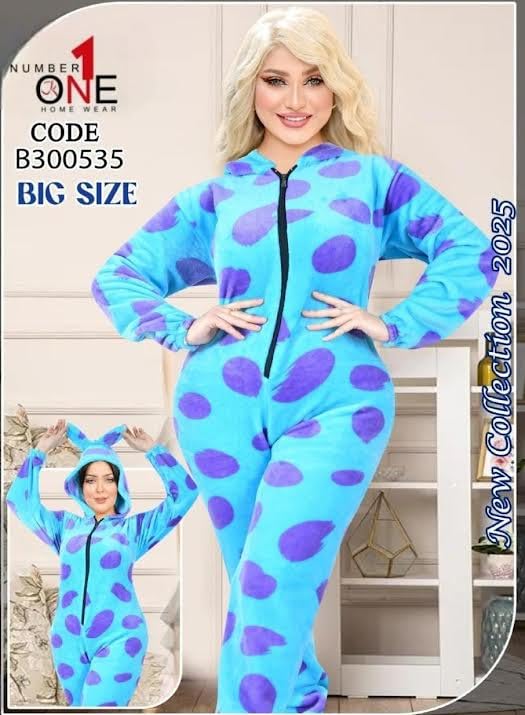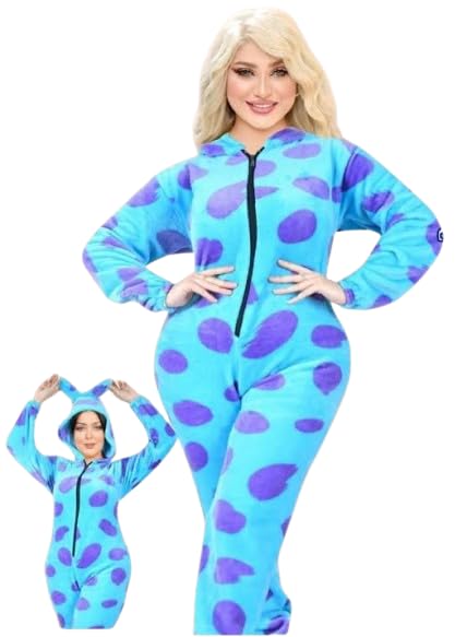 Generic - بيجامة من قطعة واحدة للنساء، جمبسوت فرو شتوي مع هودي، نمط منقط ازرق وارجواني، خامة صوفية، سوستة مقاس واحد من 55 الى 75 كجم