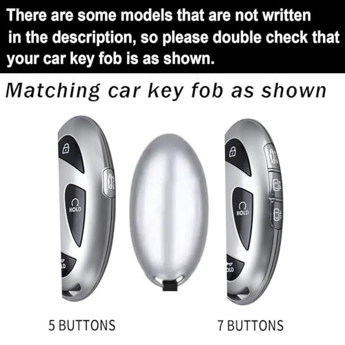 - {الطرازات المناسبة} : جراب المفتاح هذا متوافق مع سيارة ايونيك 6 جراندور GN7 وكونا والنترا وازيرا 2023 2024 وسوناتا هايبرد وسانتا في 2024 وتوسان هايبرد 2025 وما إلى ذلك. (يحتوي الجزء الجانبي على فتحة ويناسب مفتاح التحكم بـ 5/7 أزرار. *ملاحظة*-- يرجى الرجوع إلى المفاتيح المطابقة الموضحة في الصورة وقد يختلف مفتاح السيارة أيضًا بسبب السنوات المختلفة حتى لو كان موديل السيارة نفسه.