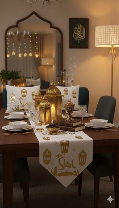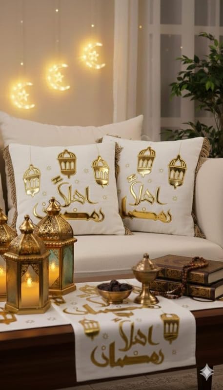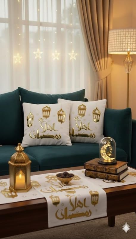 - اووبس - مجموعة ديكور رمضان الفاخرة المكونة من 3 قطع تتضمن 2 غطاء وسادة فاخر مزين بالذهب ومفرش طاولة إسلامي مطابق لمظهر كامل وأنيق.