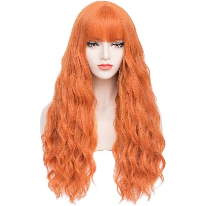 Generic - باروكة شعر مستعار طويل مموج، لون برتقالي، مع غرة، شعر صناعي
