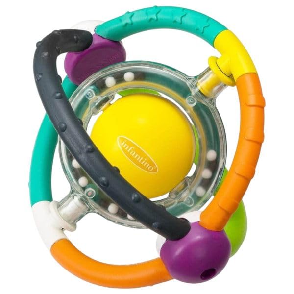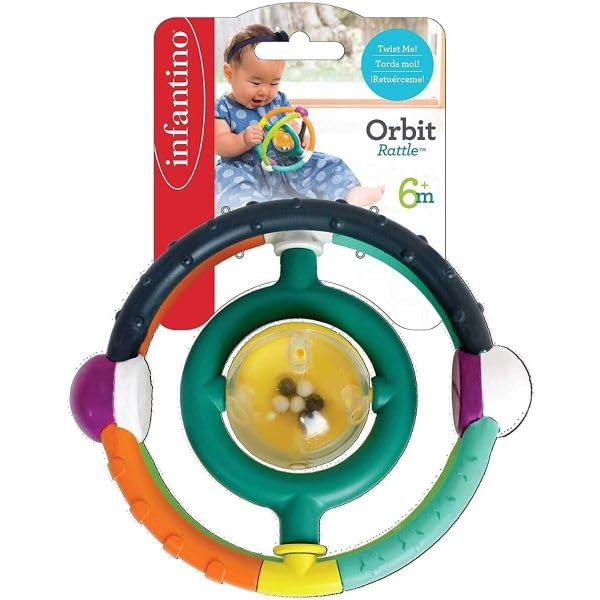 - مزايا التصميم: خشخيشة مدارية متعددة الألوان مع كرة شفافة تحتوي على كرة صفراء دوارة وخرز أبيض صغير لجذب التحفيز البصري والسمعي