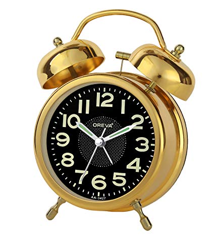 OREVA - ساعة منبه بهيكل معدني مزدوج الجرس من اوريفا مع توهج ليلي وضوء LED (مقاس 9.5 ×5.5 × 14.5 سم)، AA3427) (ذهبي)