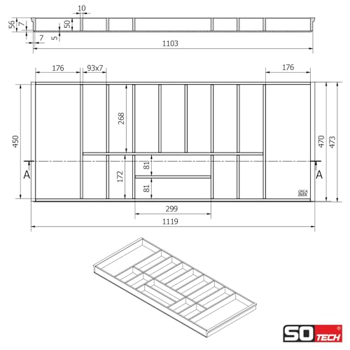- الأبعاد: للخزانات بعرض 1200 ملم (انظر الرسم!). تم تصميم قاعدة الخيزران بسمك 5 ملم بحيث تبرز قليلاً من الأمام، مما لا يترك مساحة لرؤوس مسامير مقبض الأثاث فحسب، بل توفر أيضًا الحماية ضد الخدوش عند تحريك الحشو. في المطابخ ذات حواف الدرج المنحدرة، يجب أن يكون العرض الداخلي للدرج بارتفاع 56 ملم مساويًا تمامًا لعرض الحشو.