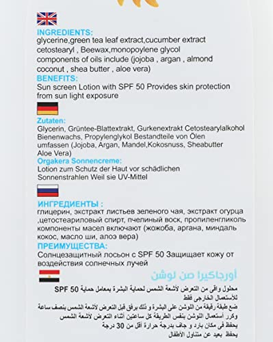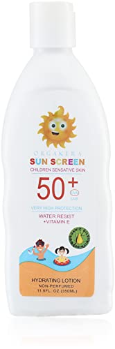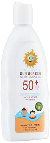 Orgakera - لوشن واقي من الشمس للأطفال وللبشرة الحساسة بحماية عالية للغاية الأشعة فوق البنفسجية الطويلة/المتوسطة 50+ مقاوم للماء ومرطب بفيتامين اي وغير معطر أورجاكيرا 350 مل غسول