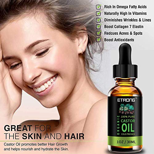 ETRONG - زيت خروع عضوي نقي معصور على البارد للشعر والرموش والحواجب والبشرة ونمو الشعر والوجه و5 فرش لتحديد العيون والحواجب، (30 مل/1 اونصة)