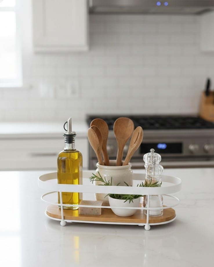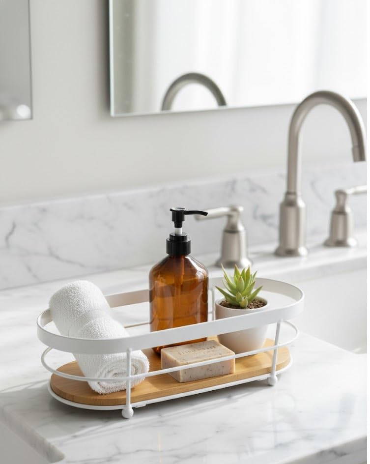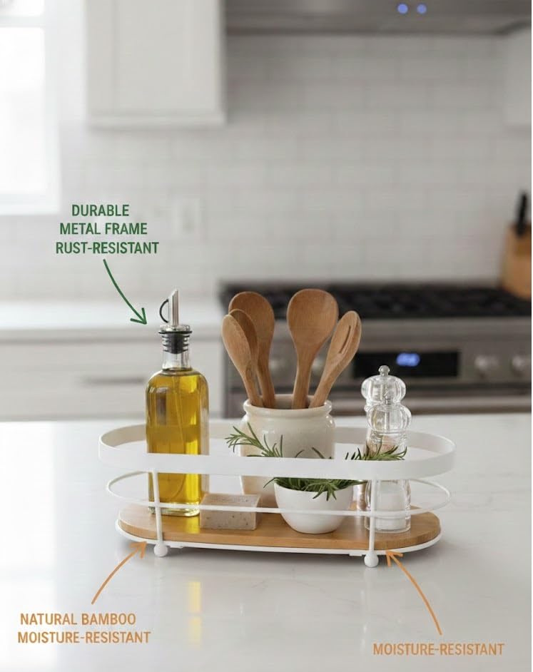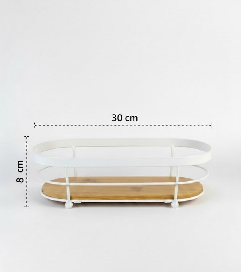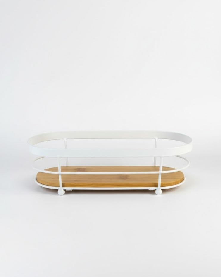 Generic - صينية تخزين منظمة لسطح الطاولة باطار معدني وقاعدة من الخيزران لحوض المطبخ والحمام (لون ابيض)