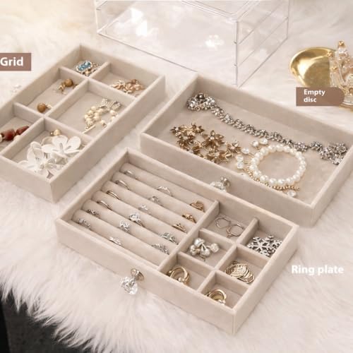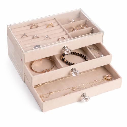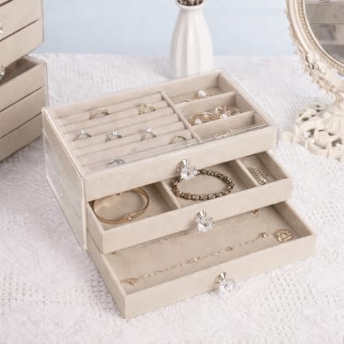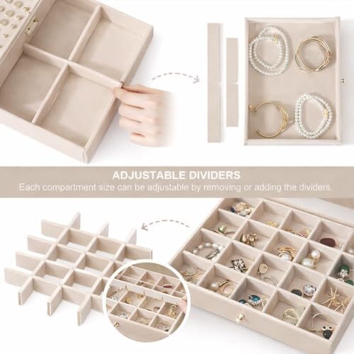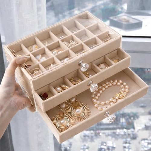 Generic - صندوق منظم مجوهرات للسفر من 3 طبقات لتخزين الاقراط والخواتم والاساور، حامل مجوهرات من 3 طبقات مقاوم للغبار لطاولة الزينة بتصميم عصري X-196 (بيج)