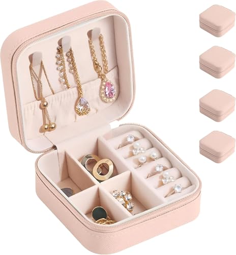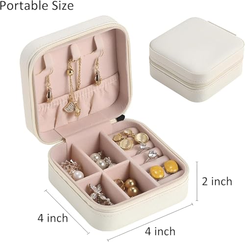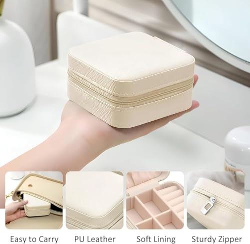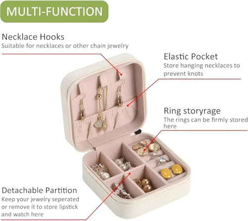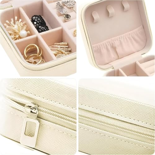 - تصميم صغير الحجم: علبة تخزين مجوهرات أنيقة محمولة بجزء خارجي كريمي أنيق وبطانة داخلية ناعمة بلون وردي، مثالية للسفر والتخزين اليومي.