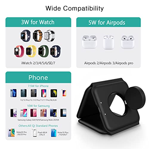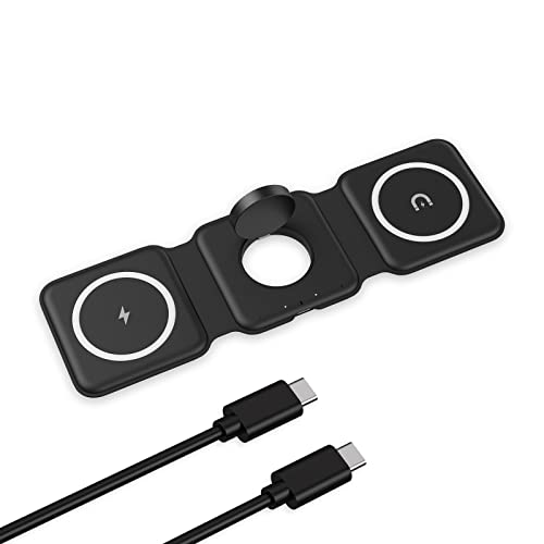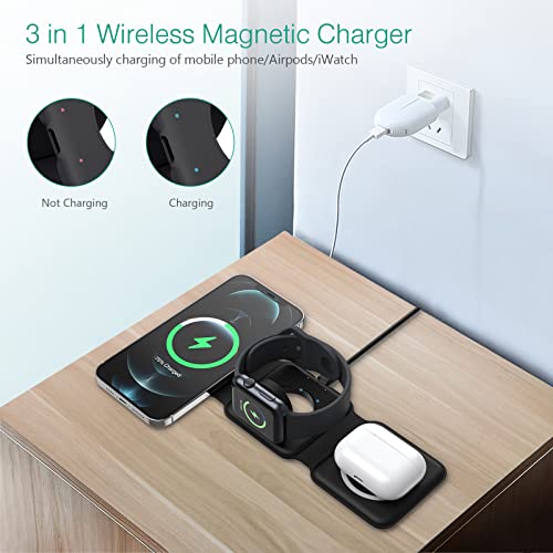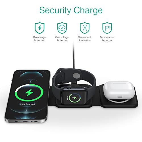 ORIA - شاحن لاسلكي 3 في 1 من اوريا قاعدة شحن مغناطيسية قابلة للطي حثي لاسلكية سريعة 15 وات للموبايل لآيفون ايربودز اي ووتش - أسود
