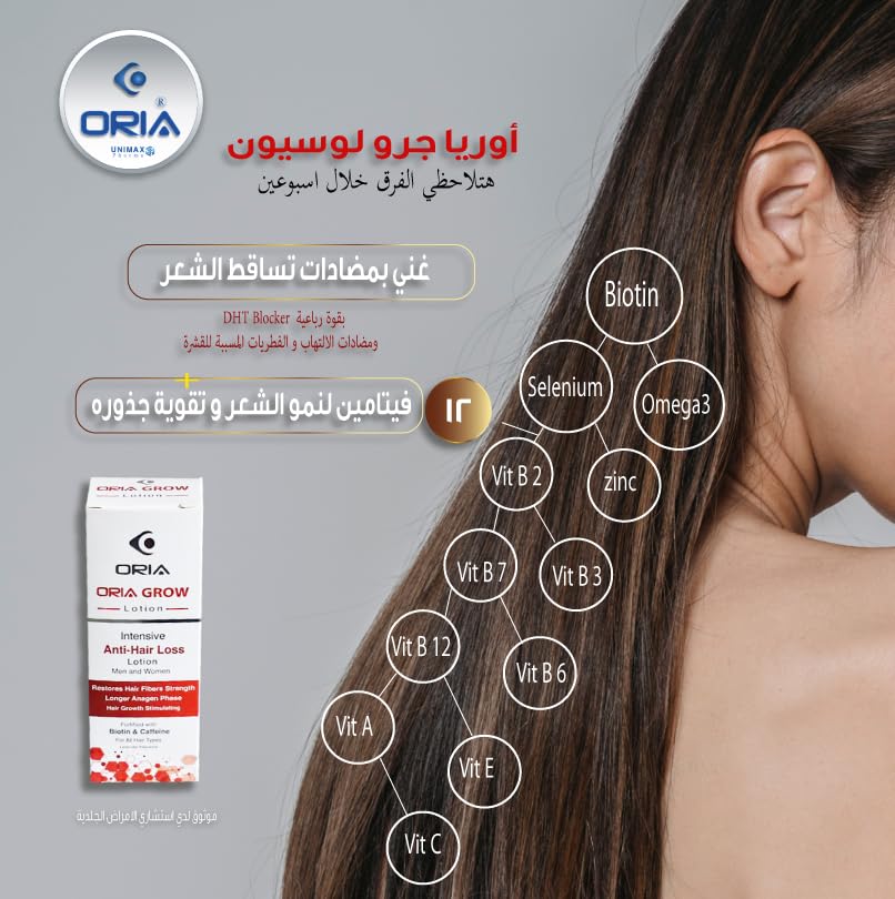 ORIA - أوريا جرو لوسيون - مضاد لتساقط الشعر - 120 مل بتركيبة عالية التركيزات من مضادات تساقط الشعر وتحفيز نمو الشعر مع البيوتين و 12 فيتامين لتغذية بوصيلة الشعر وتقوية اطرافه من التقصف