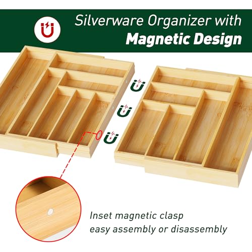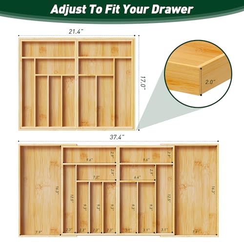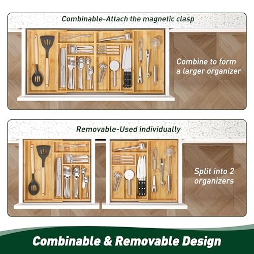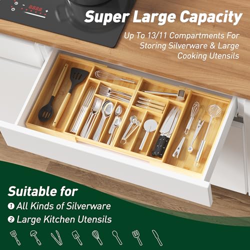 - 【قابل للتوسيع ليناسب معظم أدراج المطبخ القياسية】منظم أدراج الخيزران العميق الخاص بنا مثالي لتوفير مساحة تخزين المطبخ، بفضل أدراج التخزين القابلة للتعديل التي تمتد من 17 انش × 13 انش إلى 17 × 19.7 انش مع فتحات عميقة 1.9 انش. يمكن سحب هذا الدرج ببساطة بعيدًا عن كلا الجانبين ليمتد من 7 إلى 9 مساحات تخزين إضافية ولجعل الدرج الأوسع أكثر استقرارًا. تتوفر مساحات تخزين مختلفة الحجم لتخزين أدوات المائدة الفضية القياسية وأدوات المائدة الكبيرة.