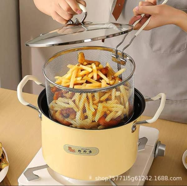 - باسكت شبك ذكي لتصفية الزيت: مزودة بسلة شبكية بمقبض ستانلس ستيل تسمح برفع الطعام وتصفيته من الزيت الزائد بسهولة، مع إمكانية تثبيتها على حافة الحلة للحصول على أكل صحي أقل دهوناً