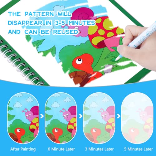- [سهلة الاستخدام] -- فقط أضف الماء إلى القلم وارسم على كتاب الأصباغ المائية لرؤية الألوان والصور المخفية، وسوف تختفي بشكل طبيعي بعد 5-10 دقائق من الجفاف حتى تتمكن من استخدام ألوان الألوان المائية لتكرار الكتابة والرسم.