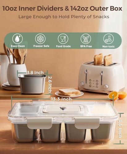 - أكواب قابلة للإزالة مع أغطية: 8 أكواب قابلة للإزالة بسعة 10 اونصة تجعل حاوية صندوق الوجبات الخفيفة هذه مغيرة، ويمكنها الحفاظ على جميع وجباتك الخفيفة منظمة بشكل مثالي ويسهل الوصول إليها؛ يمكن للأغطية الداخلية المجهزة الحفاظ على الطعام طازجًا مع منع النكهات المتقاطعة، كما أنها تمنع الطعام الجاف من الانسكاب حتى إذا انقلبت الحاوية.