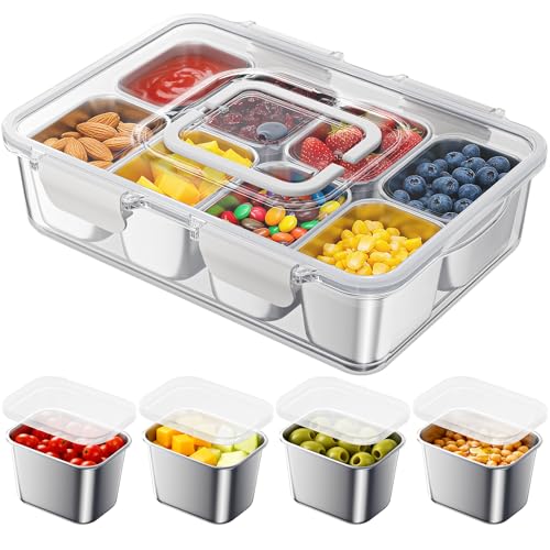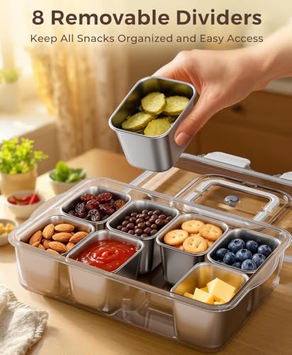 - ساحر الفضاء: مع 8 مساحات تخزين قابلة للإزالة، يمكن استخدام حاوية الوجبات الخفيفة هذه كمجموعة للوجبات الخفيفة أو الخضار أو الفواكه أو تشاركوتيري أو بار السلطة أو بشكل منفصل. يمكنك وضع مواد غذائية أكبر فيها، وترك فاصلين فقط أو أي الكثير من التوابل أو الأشياء التي تريدها. مطابقة متعددة الاستخدامات، استخدامات متعددة.