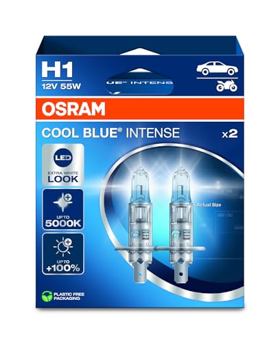 Osram - مصباح أمامي 64150CBN-HCB هالوجين H1 كول بلو انتنس بسطوع أعلى بنسبة 100% حتى 5000 كلفن مظهر ليد عبوة مزدوجة من اوسرام، (مصباحين)