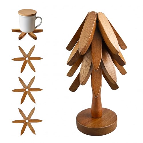 - مجموعة قواعد أكواب بتصميم الشجرة: قاعدة الأكواب الخشبية المستوحاة من شكل الشجرة تُعد إضافة عملية وأنيقة للمطبخ، إذ تمنع التلامس المباشر بين أدوات المائدة الساخنة وسطح الطاولة، مما يحميها من الحروق ويُطيل عمر الأثاث.