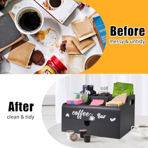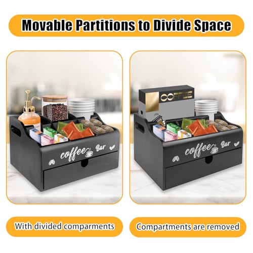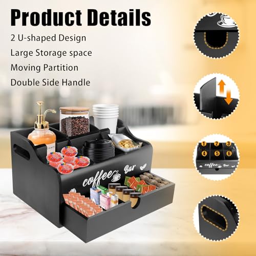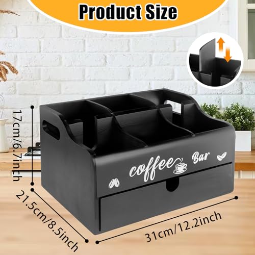 - 【منظم بار القهوة ذو سعة كبيرة】يوفر تصميم الدرج منظمًا متعدد الوظائف لخزانة المؤن الخاصة بك أكثر أناقة وتنظيمًا، يحتوي منظم القهوة هذا على 6 مساحات تخزين واسعة و3 مساحات تخزين متحركة في الخلف لتخزين أكواب القهوة والقشات وعصي التحريك وعلب حبوب القهوة والمزيد. يحتوي الدرج على 5 مساحات تخزين قابلة للتعديل لتخزين السكر وأكياس الشاي والقهوة الفورية.