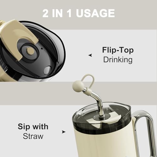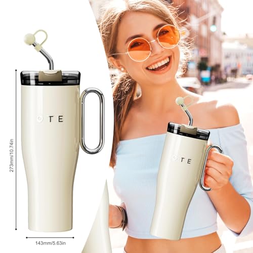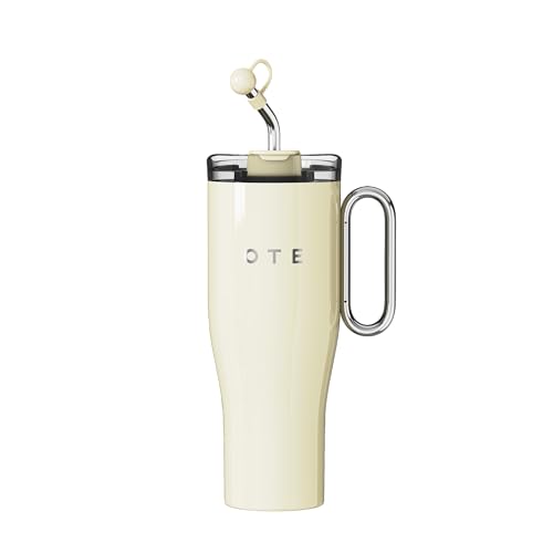OTE - كوب بسعة 1.2 لتر مع مقبض وغطاء بماصة من او تي اي، كوب قهوة معزول بتفريغ الهواء من الستانلس ستيل بجدار مزدوج وخال من البيسفينول ايه، يحافظ على المشروبات باردة او ساخنة (ابيض)