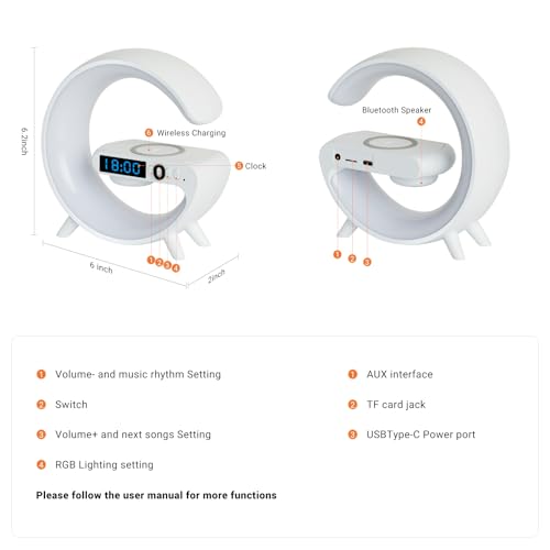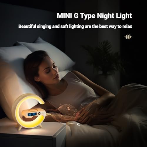 OTeedo - مصباح صغير لتغيير الأجواء على حرف G بشحن اللاسلكي من اوتيدو مع مكبر صوت بلوتوث وساعة منبه وضوء ليلي بقدرة 15 وات وشاحن لاسلكي مناسب كأباجورة بجانب السرير والساعة بجهاز صوت وإضاءة محيطية لهدايا