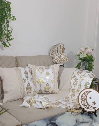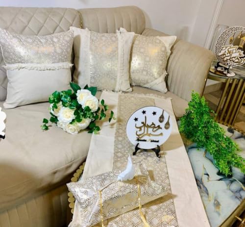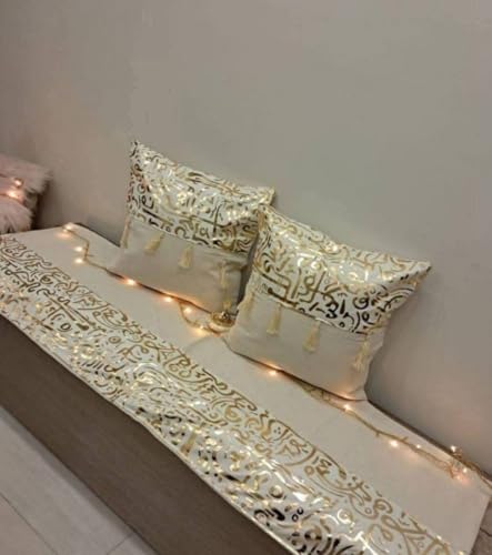 Generic - طقم رانر اخر 3 قطع، رانر طاولة 150×50 سم مع 2 غطاء وسادة 45×45 سم، قطن، تصميم انيق ذهبي وأبيض، بسوستة
