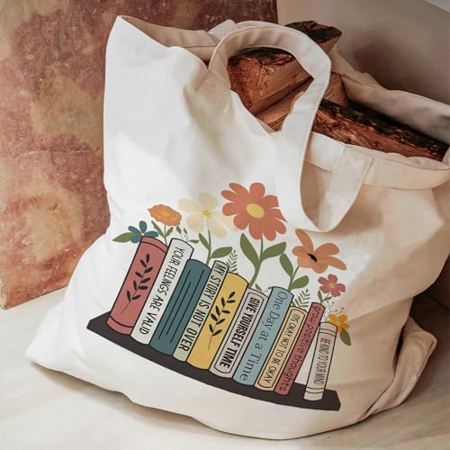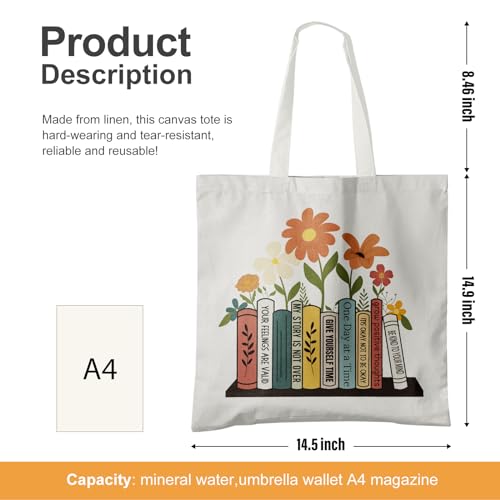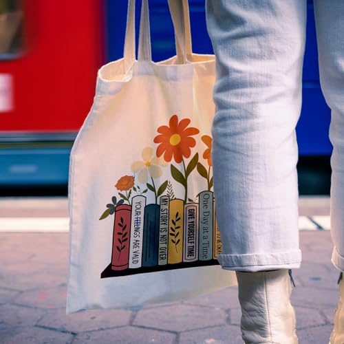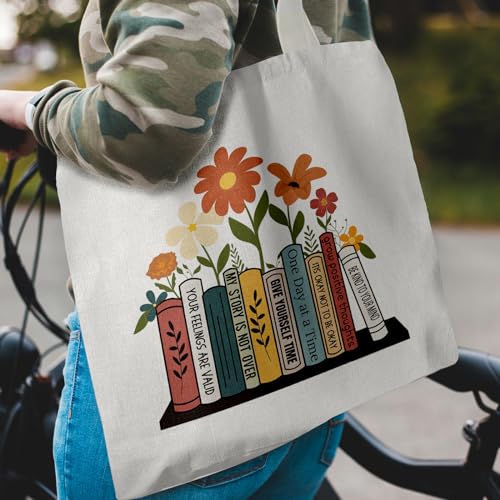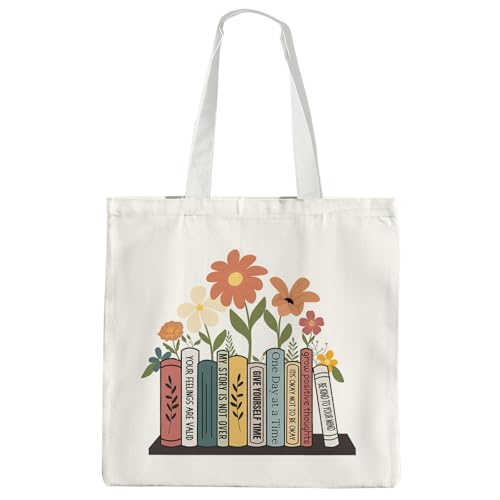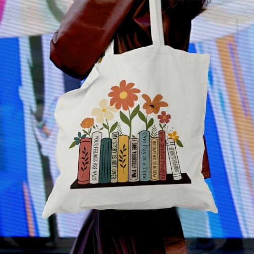 OTOUO - شنطة توت قماشية للصحة العقلية من اوتوو، شنطة قابلة لاعادة الاستخدام لمحبي الكتب، شنطة كتف قماشية ملهمة مزينة بالزهور، هدايا لمحبي الكتب، هدايا ملهمة للنساء