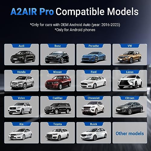 - 【 الموديلات المتوافقة】يتوافق محول السيارة A2Air برو بنظام أندرويد من اوتوكاست مع مجموعة كبيرة من السيارات التي تدعم نظام أندرويد اوتو السلكي من المصنع. سواء كنت تمتلك علامة تجارية أمريكية شهيرة للسيارات مثل فورد أو شيفروليه أو دودج أو أي سيارة أخرى مجهزة بنظام أندرويد اوتو السلكي من المصنع، فإن محول A2Air برو هو الترقية المثالية لسيارتك. استمتع براحة الاتصال اللاسلكي دون الحاجة إلى أي تعديلات إضافية أو تركيبات معقدة.