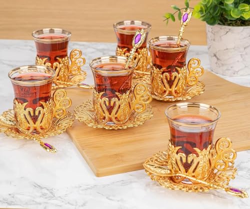 - تصميم أنيق: طقم شاي تقليدي على الطراز العثماني يضم 6 أكواب زجاجية موضوعة في حوامل ذهبية مزخرفة مع أنماط مخرمة معقدة وملاعق كريستال أرجوانية مزخرفة