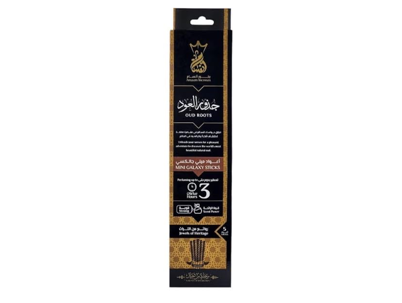 - عبوة مناسبة: تحتوي على 5 أعواد بخور صغيرة، مثالية للاستخدامات المتعددة أو لتجربة عطر جذور العود الفاخر.