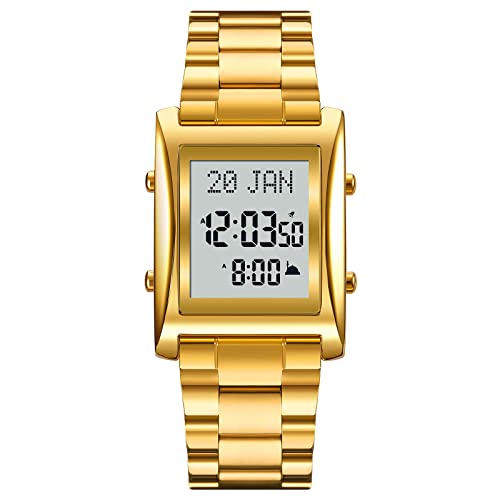 OUNA - اونا ساعة رقمية اسلامية 1815 للصلاة وبوصلة القبلة والتقويم الهجري واشارة مرجعية للمدينة ومنبه واضاءة خلفية مقاومة للماء حتى عمق 30 متر للرجال ، اذان رقمي بمينا أبيض بسوار ذهب