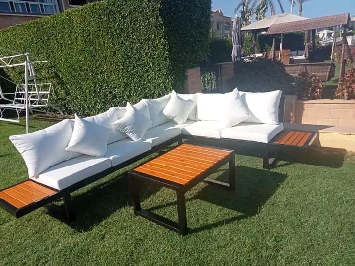 Generic - ركنة خارجية بإطار معدني معالج مع وسائد بيضاء وطاولات خشبية برتقالية، أثاث حديقة عصري