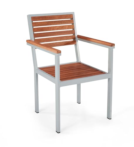 Generic - كرسي طعام خارجي مع مساند للذراعين، اطار خشبي ومعدني، تصميم مسطح، رمادي وبني
