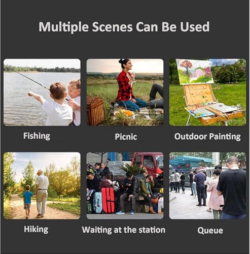 - تصميم قابل للطي سهل الحمل والتنقل ينطوي لحجم مدمج جدًا ويمكن حمله على الكتف باستخدام الحزام المرفق، مثالي للتنقل في الرحلات، الحديقة، الصيد أو المهرجانات.