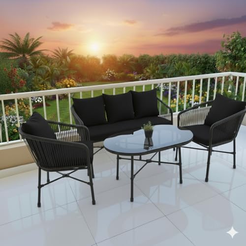 Generic - طقم أثاث حديقة خارجي 4 قطع، اسود بسود، معدن مطلي بدهان إلكتروستاتيك، مقاوم للرطوبة والصدأ، يتضمن كنبة ثنائيه وكرسيين وطاولة زجاجية، تصميم عصري