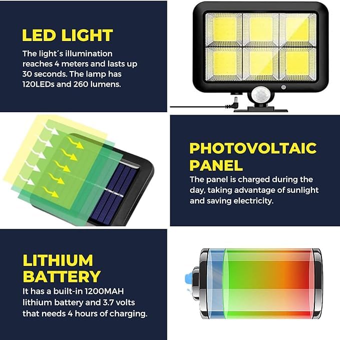 Spaceshoop - مصباح شمسي خارجي 120 مصباح ليد 260 لومن + لوحة كهروضوئية بتصميم منفصل مع كابل بطول 4 م ومستشعر حركة، مصباح ليد للإضاءة الخارجية: فناء، حديقة، جراج.