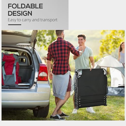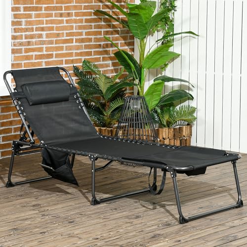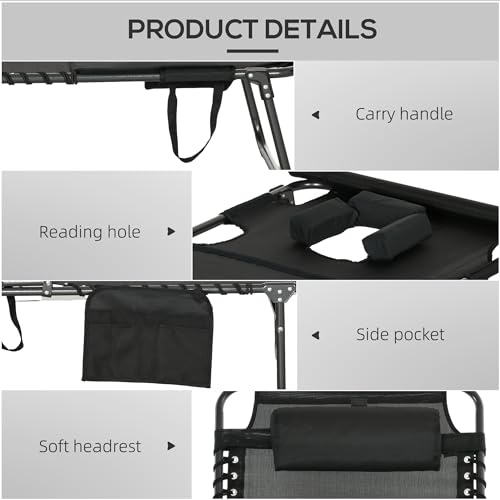 Outsunny - اوتسوني كرسي استرخاء قابل للطي مع 5 مستويات ظهر مائل، كرسي تسمير في الهواء الطلق مع فتحة وجه للقراءة، كرسي استرخاء خارجي مع جيب جانبي ومسند راس للشاطئ، الفناء، اسود