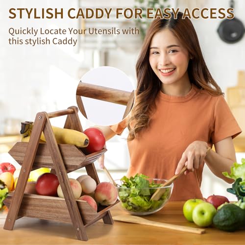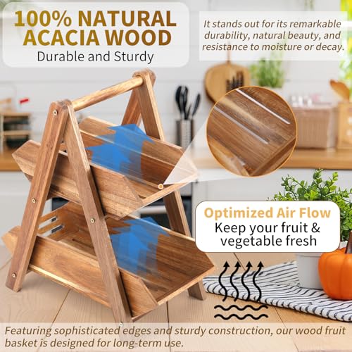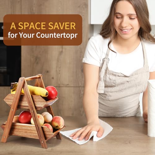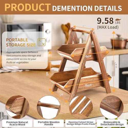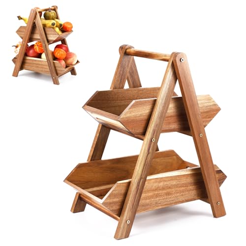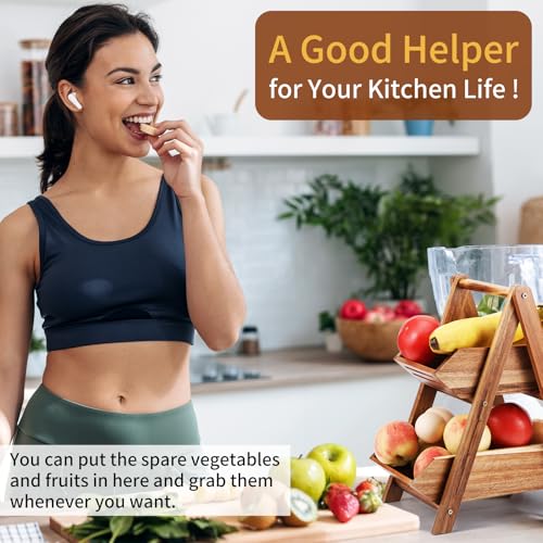 Ouvibor - سلة فاكهة من خشب الاكاسيا اوفيبور طبقتين لطاولة المطبخ حامل بسعة كبيرة فواكه قابل للفصل منظم محمول للخضروات والخبز والوجبات الخفيفة بني