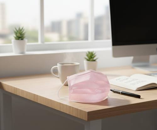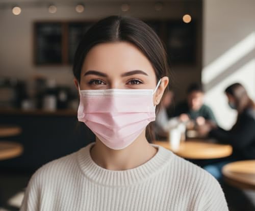 OVA - أقنعة وجه للاستعمال مرة واحدة من او في اي، مغلفة بشكل فردي - 50 كمامة، حماية من 3 طبقات للاستخدام اليومي، لون وردي