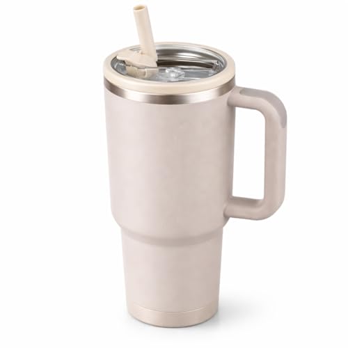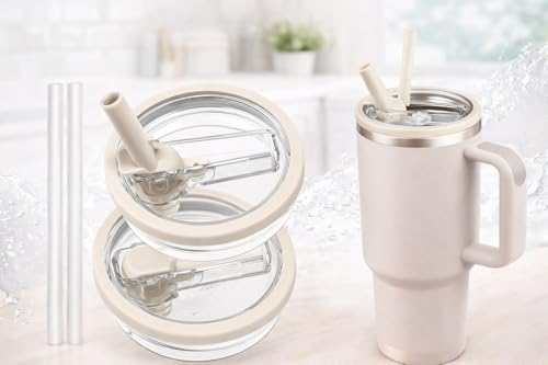 OVA - او في اي غطاء بديل بقشة قلاب متوافق مع غطاء ستانلي مقاوم للتسرب ومقاوم للانسكاب وقابل لاعادة الاستخدام مع تصميم ماصة قابلة للطي (بيج)