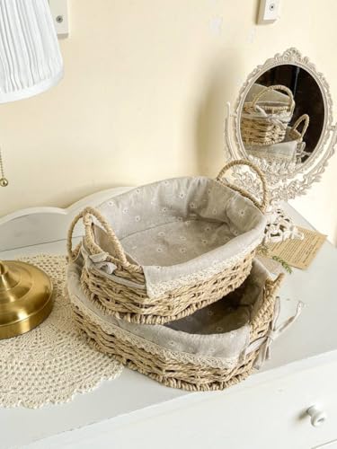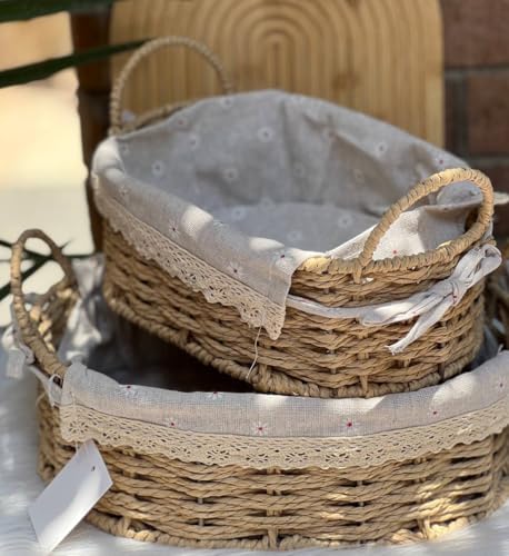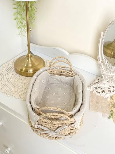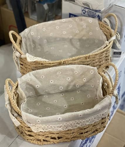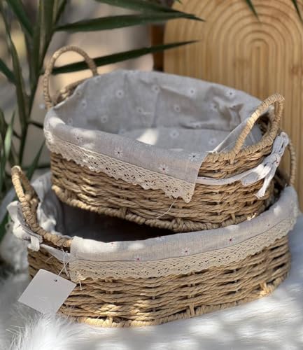 Generic - طقم باسكت رتان مجدول بيضاوي 2 قطعة بغطاء قماش كتان منقوش وقوائم معدن مغطاة بالرتان – منظم تخزين أنيق للمنزل