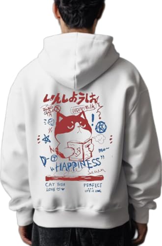 Generic - سويت شيرت كبير بغطاء للرأس للشباب بعمل خاص عبارة عن رسمة فنية ونص كبير الحجم من الخلف 104 ورسمة قط، لون أبيض