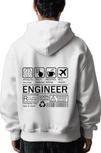 Generic - سويت شيرت بغطاء للرأس وقصة فضفاضة وطباعة نصية خلفية «Engineer» للشباب، لون أبيض، 37